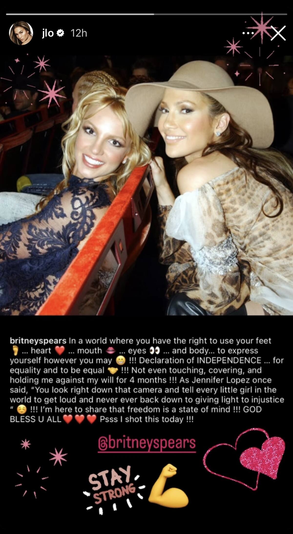 "Mantente fuerte", escribió Jennifer Lopez en sus historias de Instagram, y compartió una publicación de Britney, con una instantánea de los dos artistas cuando asistieron a los MTV Video Music Awards de 2001. Spears citó a JLo en la publicación original, mientras reflexionó sobre la "independencia" y la "igualdad".