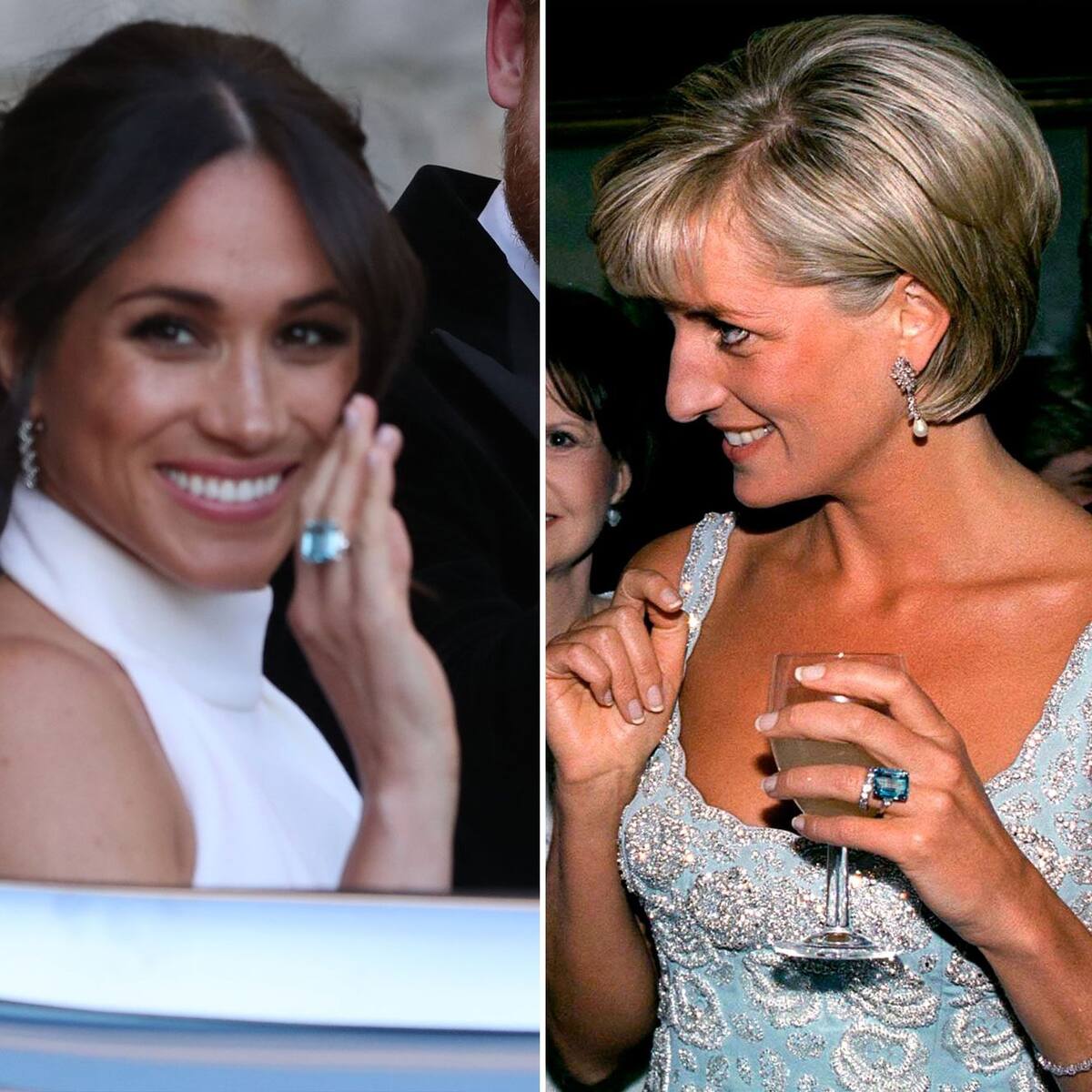 Tras su boda con el príncipe Harry, Meghan Markle fue vista luciendo el anillo aguamarina celeste de Diana de Gales.