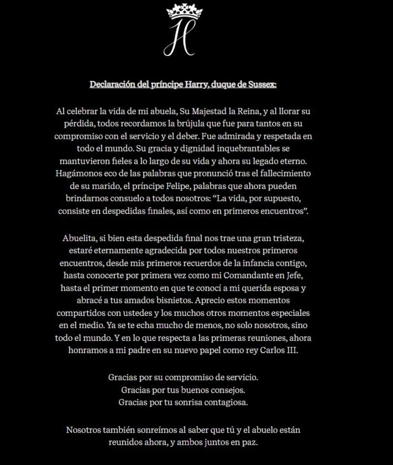 El protocolo real fue ignorado totalmente por el príncipe Harry, por lo que fue sumamente cercano a lo largo de su escrito: "Abuelita, si bien esta despedida final nos trae una gran tristeza, estaré atentamente agradecido por nuestros primeros encuentros, desde mis primeros recuerdos de la infancia contigo, hasta conocerte por primera vez como mi comandante en jefe. Hasta el primer momento en que conocí a mi querida esposa y abracé a tus amados bisnietos".