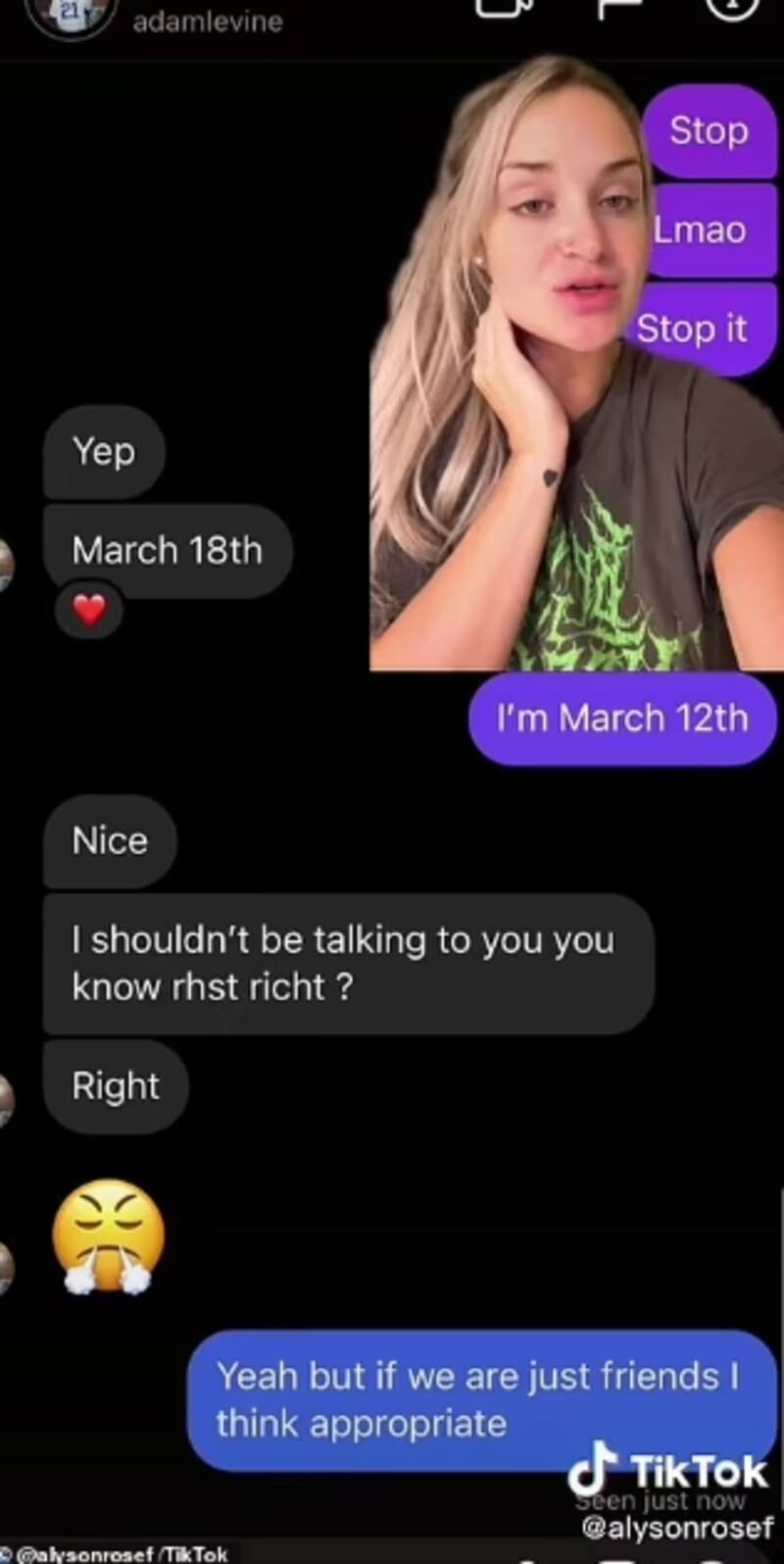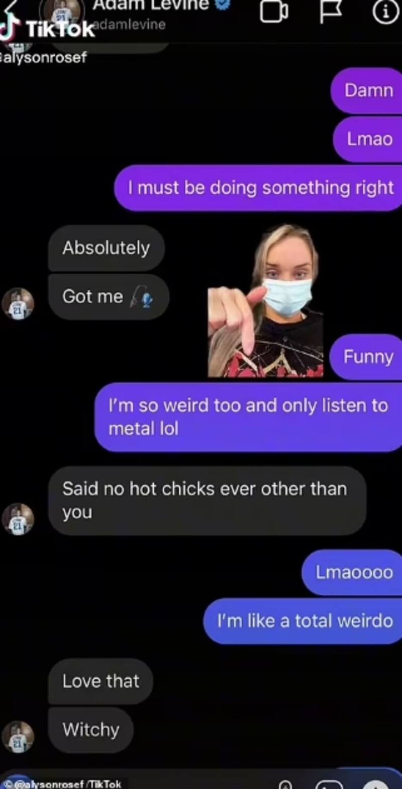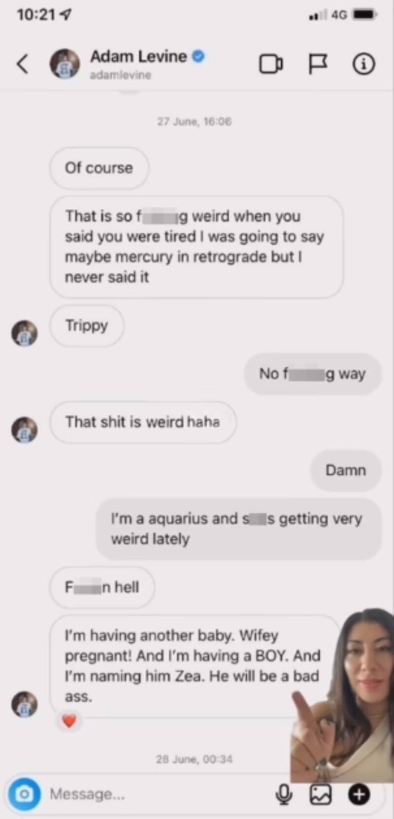 Adam Levine tampoco le niega su relación, dado que otra captura de pantalla se ve cómo le cuenta a la mujer que su esposa está embarazada y tendrá un niño.