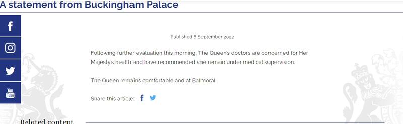 "Luego de algunas evaluaciones durante la mañana, los doctores de la Reina están preocupados por la salud de su Majestad, por lo que se ha recomendado permanezca bajo supervisión médica. La reina se encuentra cómoda en su residencia de Balmoral", señalaron desde el sitio oficial del Palacio.