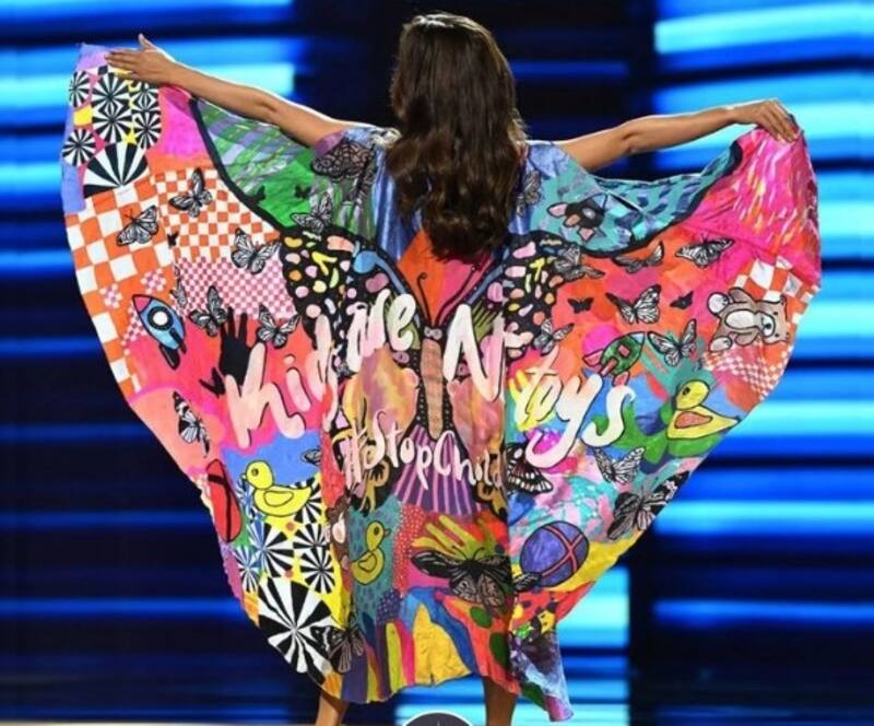 En dicha ocasión, Amanda Dudamel lució un traje de baño acompañado de una particular capa con la que buscó hacer un importante llamado en contra del abuso infantil. Para ello utilizó un traje de baño de color rosado y la capa en la parte trasera tuvo escrito "los niños no son juguetes".