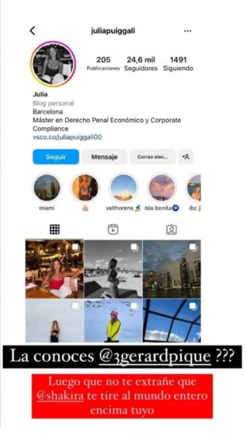 Estas especulaciones surgieron a raíz de una publicación que realizó el "paparazzi", Jordi Martin, a través de sus historias de Instagram, donde se ve el perfil y fotografía de la supuesta nueva amante de Piqué.