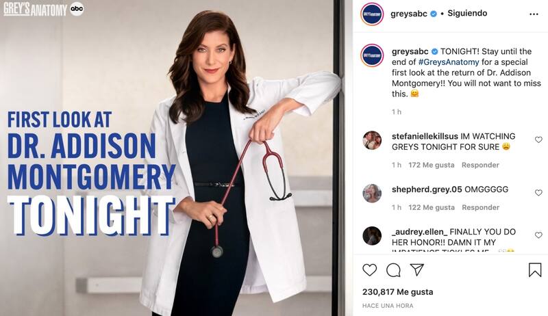 "Esta noche quédense hasta el final de #GreysAnatomy para ver un especial primer vistazo del regreso de la Doctora Addison Montgomery! No querrás perderte esto", aseguraron, desatando la emoción de sus fanáticos.