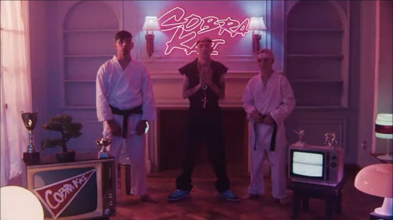 En el registro, Marcianeke viste un kimono de color negro, típico de los karatekas, y luce sus brillantes joyas mientras es acompañado por dos "estudiantes" del dojo Cobra Kai, el cual le entrega el nombre a la serie de Netflix.
