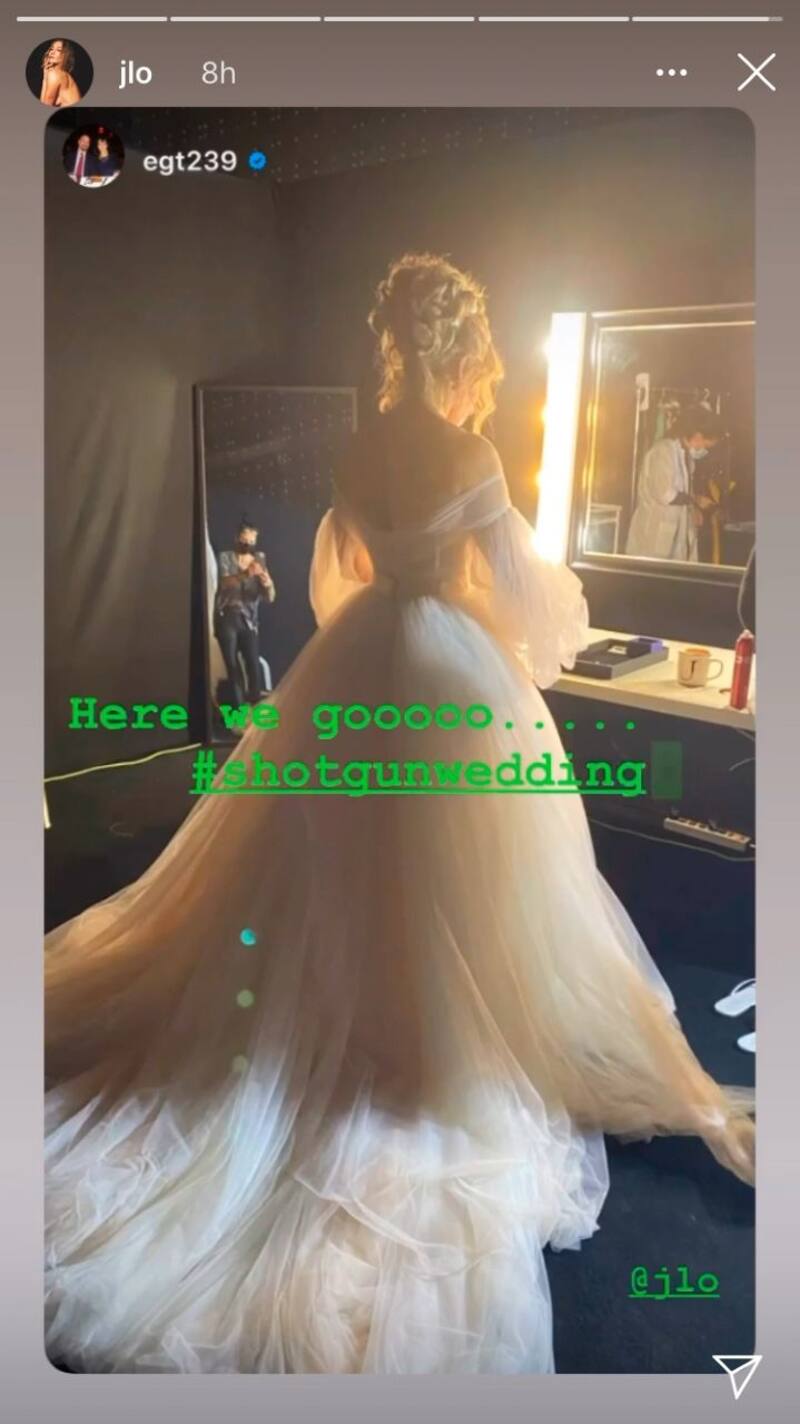 Jennifer Lopez posó con un vestido de novia en una imagen de espalda, con un diseño largo de escote barco, mangas con volumen y vaporosa falda de tul con cola a través de redes sociales. Muchos usuarios pensaron que se trataba de su boda con Alex Rodriguez, pero se llevaron la noticia de que la imagen pertenece al rodaje de su última película, "Shotgun Wedding".