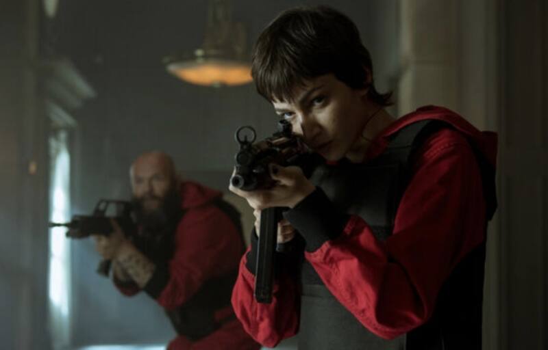 La actriz española posó con el uniforme de los atracadores de la producción y, sobre ella, se ve que carga un arnés lleno de armamentos de lo que parecen ser granadas y otros objetos. Además, en sus manos, sostiene un gran ametralladora, mientras posa muy seria para la cámara.