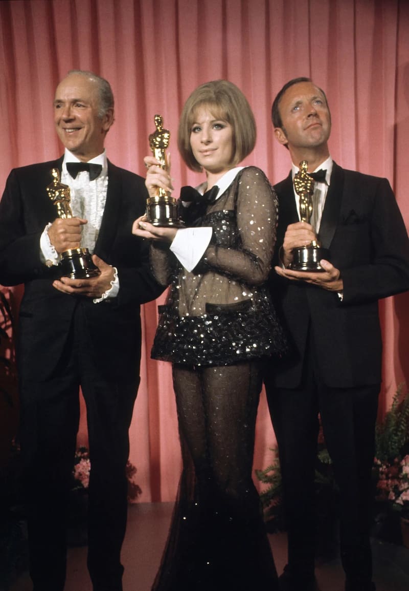 Cuando la cantante y actriz, Barbra Streisand, recogió su galardón por su actuación en "Funny Girl", se lució con un conjunto de transparencias y lentejuelas de Arnold Scaasi. El traje tenía una caída acampanada y también, jugaba con la idea de aparentar ser un esmoquin. La transparencia fue vanguardista para la época, en ese entonces la artista tenía 26 años y desató escándalo en el mundo del espectáculo.