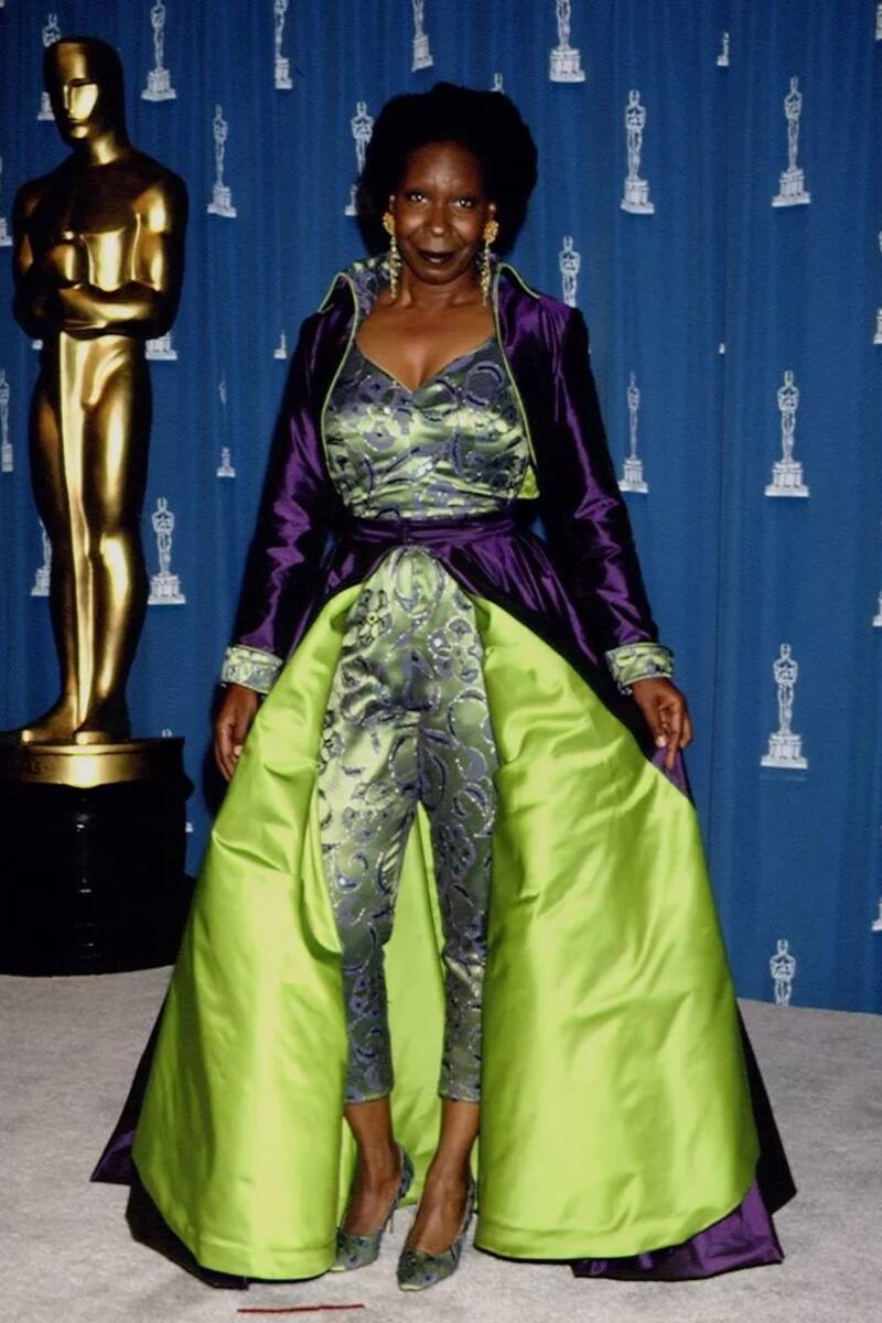 Con estilo vanguardista, la reconocida y galardonada artista teatral, Whoopi Goldberg, llegó vistiendo un llamativo conjunto de colores de morado y verde, que se complementaba con una dramática capa. El estilismo obtuvo críticas variadas, pero sin duda fue una adelantada a los tiempos.