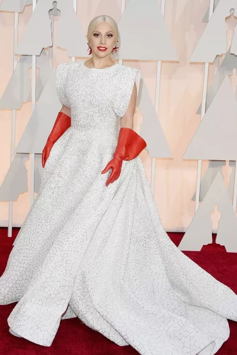 En la antesala de los premios de la Academia 2014, la estrella del pop, Lady Gaga, llamó la atención con un particular conjunto de Atelier Versace, confeccionado con sutiles tonos rosado y cuyos acentos dorados replicaban las típicas formas de Art Decó, pero lo más comentado fue el uso de unos estrafalarios guantes rojos.