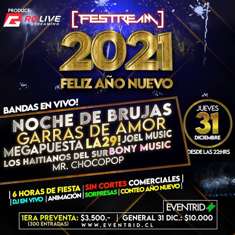 El 31 de diciembre llega Festream Año Nuevo 2021, la que promete ser la fiesta online más grande de Chile. Noche de Brujas y Garras de Amor don parte de una larga lista de artistas que dirán presente en un show de 6 horas de música ininterrumpida, DJ's en vivo y muchas otras sorpresas.