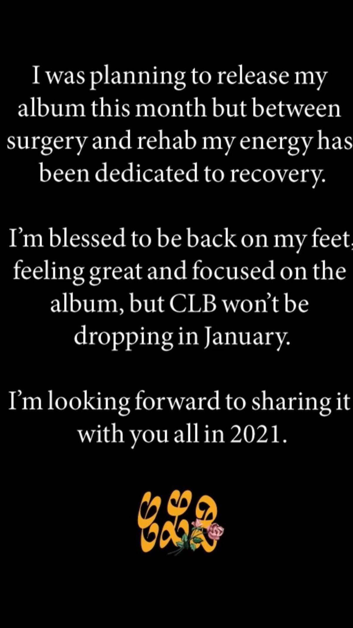 Fue el mismo rapero quien se encargó de aclarar que "estaba planeando que mi álbum saliera este mes, pero entre la cirugía y mi rehabilitación, mi energía estará más dedicada a poder recuperarme".