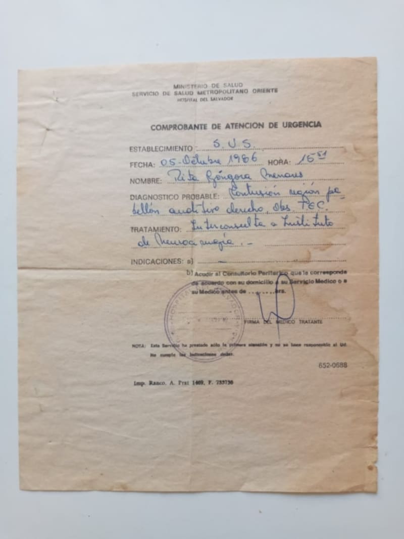En otra oportunidad, recuerda una golpiza en donde el mismo cantante fue quien tuvo que llevarla a la Clínica Indisa: "Me fracturó la cara, y le dijo al doctor que me lo había hecho con una raqueta de tenis. El doctor miró y no dijo nada". Según confesó Rita Góngora al medio antes mencionado, denunció al menos ocho veces las agresiones del cantante a Carabineros, ya que debido a los golpes no tiene una audición al 100% y tiene una cicatriz en el párpado izquierdo. Hasta el día de hoy conserva los documentos del Servicio de Salud Metropolitano Oriente. El diagnóstico fue claro: traumatismo encefalocraneano.