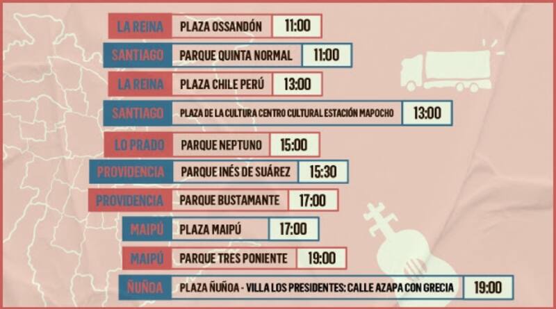 Las plazas Ossandón (11:00) y Chile-Perú (13:00) de La Reina, el Parque Quinta Normal (11:00) y la Plaza de la Cultura de la Estación Mapocho (13:00) en Santiago, el Parque Neptuno de Lo Prado (15:00), los parques Inés de Suárez (15:30) y Bustamante (17:00) en Providencia, y la Plaza Maipú (17:00) y el Parque Tres Poniente (19:00) en Maipú, recibirán un show cada uno a lo largo del día, mientras que en Ñuñoa está agendada para el cierre una presentación que comenzará en la Plaza Ñuñoa (19:00) y luego recorrerá parte de la comuna, para finalizar en la Villa Los Presidentes.