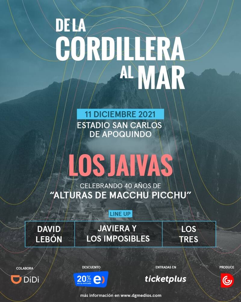 Las entradas para disfrutar en vivo a Los Jaivas celebrando 40 años de “Alturas de Machu Picchu” estarán disponibles en Ticketplus desde este viernes 19 de noviembre a las 17:00 horas con un 20% de descuento exclusivo para Clientes Entel.