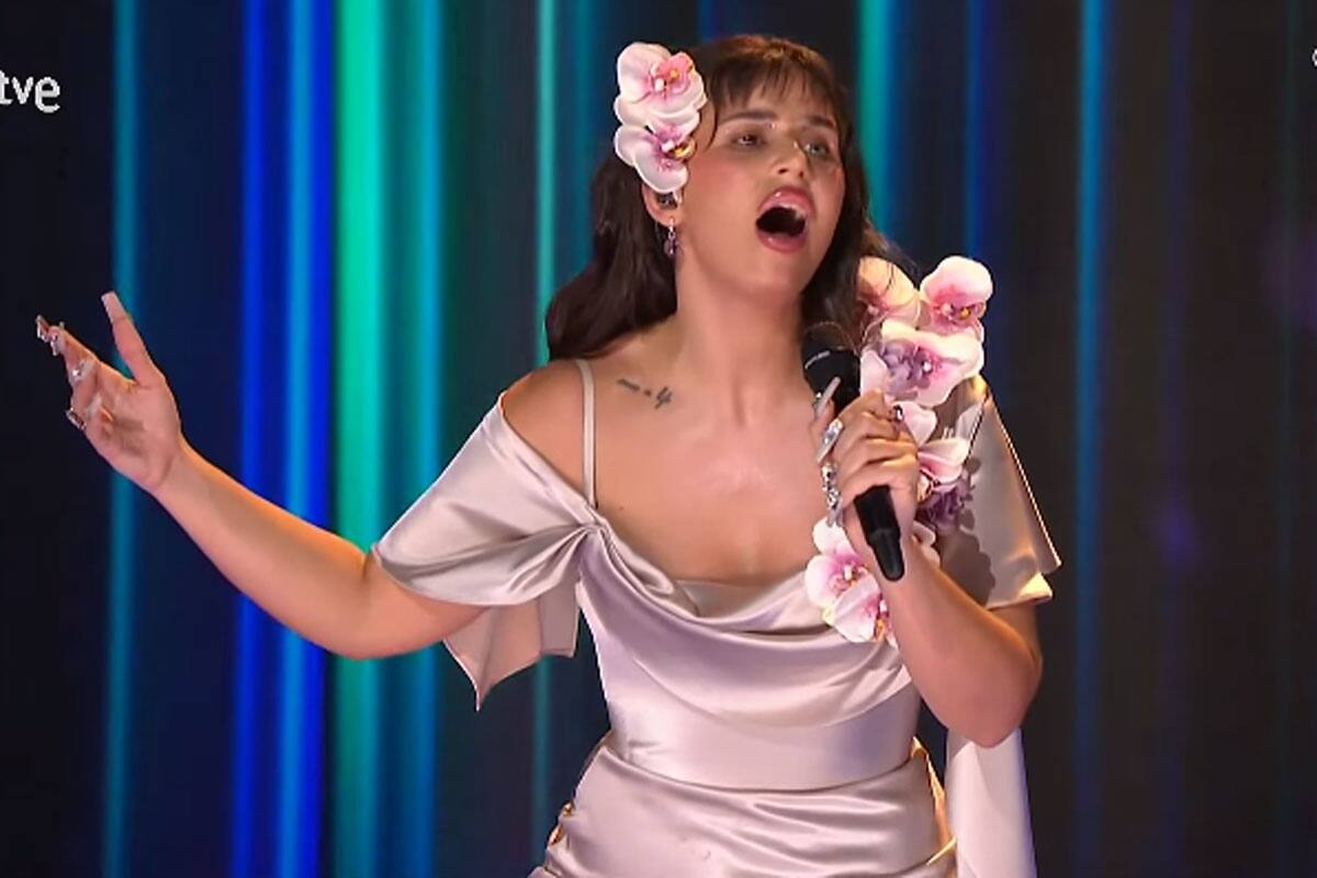 Radicada en España, cantó la canción que hizo popular Sara Montiel luciendo un vestido de gala de un tono violeta adornado de flores y acompañada de la orquesta Sinfónica de Málaga.