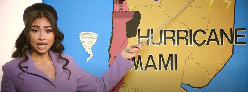 A medida que el video avanza, podemos ver a la cantante personificando a una presentadora del tiempo, quien advierte sobre el huracán "Mami".