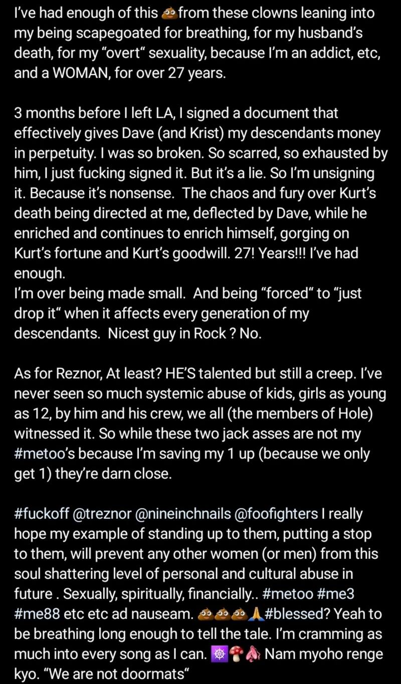 Luego, acusó que tres meses antes de dejar Los Angeles firmó un documento que le daba derechos a Dave Grohl y Krist Novaselic, ex compañeros de Kurt Cobain en Nirvana, dinero a perpetuidad, algo que ella buscaba anular tras sentir que el primero se aprovechó de su rabia y dolor.