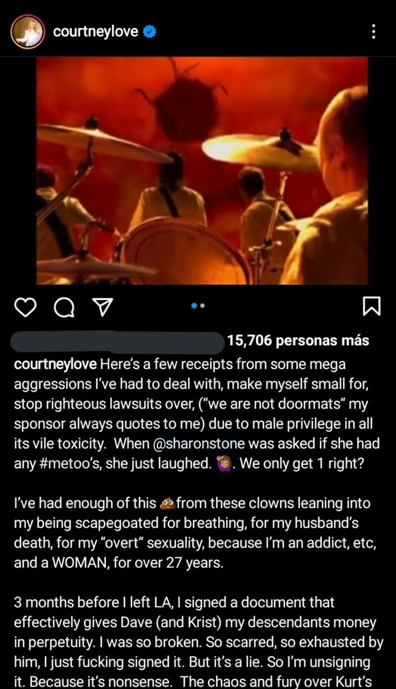 El texto ha tenido bastante comentarios y Courtney Love señaló que con este ejemplo, espera que muchas mujeres se levanten y denuncien lo que estos artistas hicieron. Pero momentos después, decidió borrar su publicación.