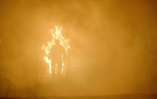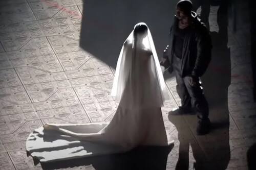 Pero la noche tenía más sorpresas. Entre ellas, el hecho de que Kanye West literalmente se prendió fuego sobre el escenario y una particular ceremonia que incluyó a su ex esposa, Kim Kardashian, con quien simulaba una boda.