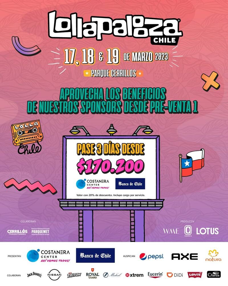 La venta de entradas para el Lollapalooza 2023 comenzó el jueves 25 de agosto de 2022 a las 12:00 horas en Puntoticket. La preventa 1 contó con un 20% de descuento para clientes Costanera Center y Banco de Chile. La entrada Early Bird tiene un precio desde los $112.000.