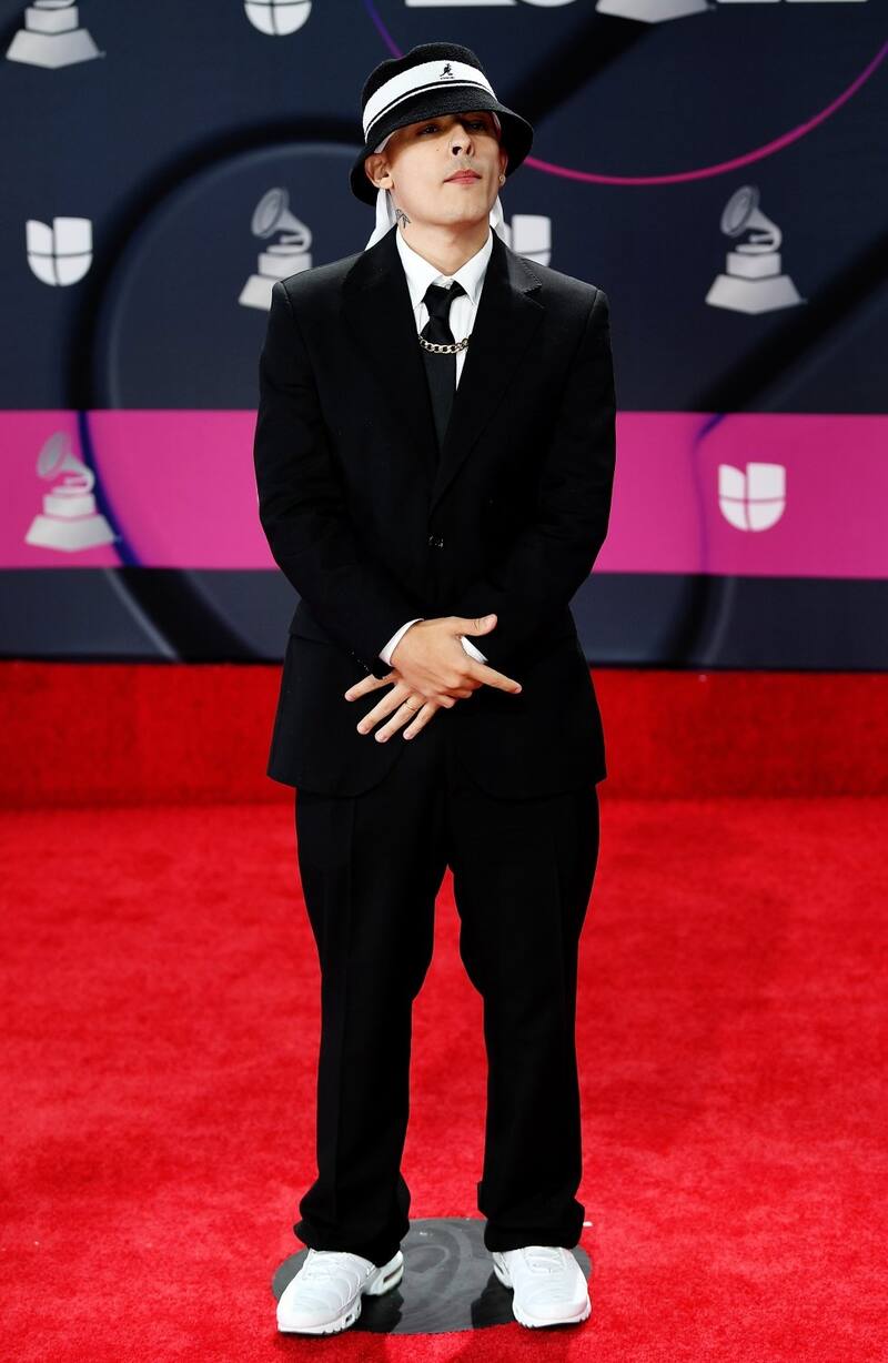 El rapero argentino lució un look muy fiel a su estilo, con una bandada blanca y un sombrero de pescador, acompañado de un elegante traje negro con camisa blanca y zapatos blancos.