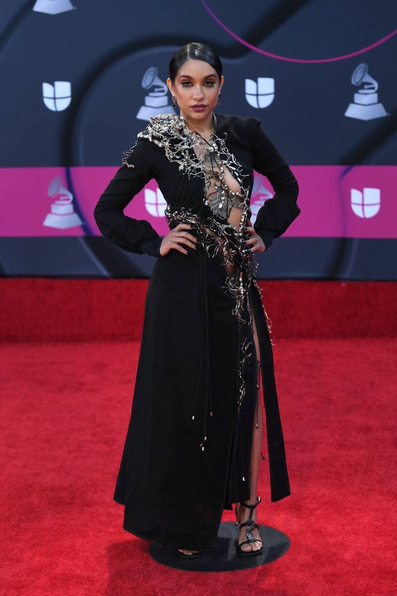 Anitta fue nominada como "Mejor interpretación de reggaetón" y "Mejor grabación del año", y lució elegante y sensual con un vestido negro strapless de seda con detalles de transparencia y accesorios plateados.