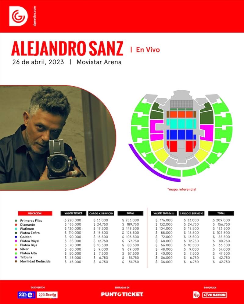 Las entradas para el concierto de Alejandro Sanz tienen un valor que va desde los $ 51.750 hasta los $ 253.000.