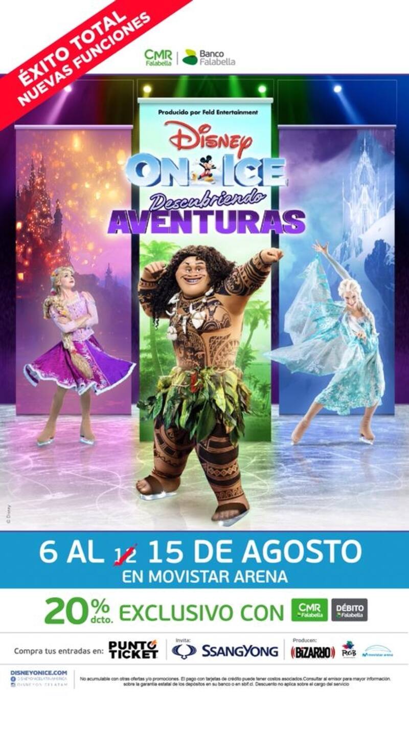 Las entradas para el show "Disney on Ice: Descubriendo aventuras" se pueden comprar a través del sistema Puntoticket. Hay un 20% de descuento con CMR Mastercard, Visa o Débito Banco Falabella que no aplica al cargo por servicio.