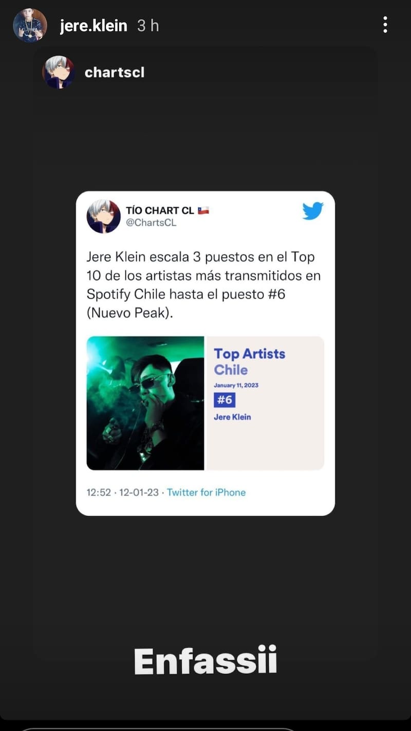 Sumado a eso, de acuerdo a la información que él mismo compartió en sus redes sociales, ha ido tomando terreno dentro Top de Artistas en Chile, ubicándose en el sexto lugar de los más escuchados.