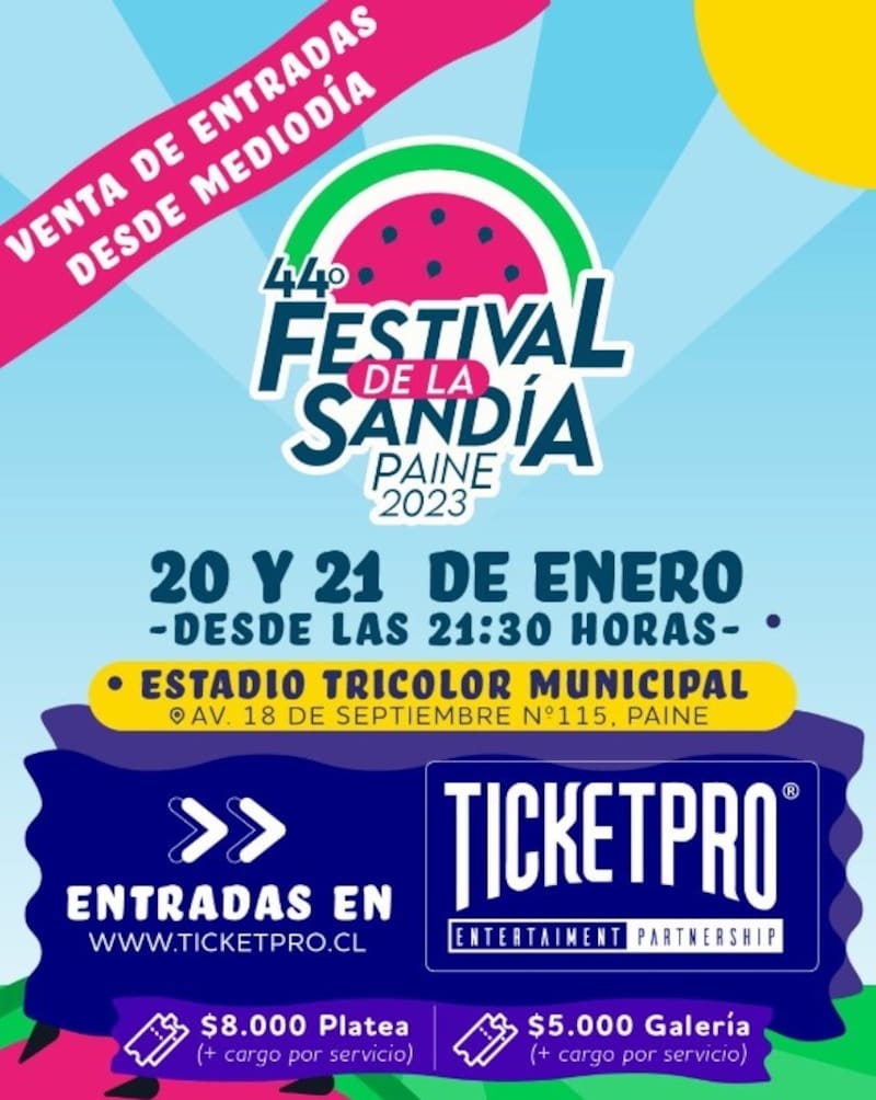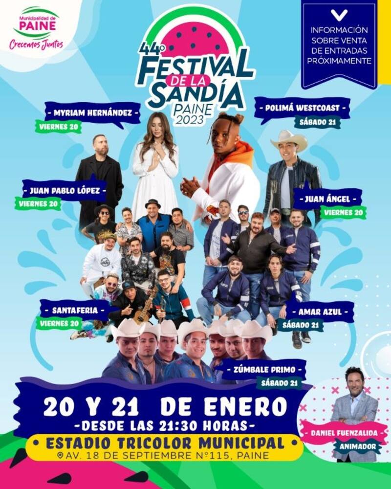El Festival de la Sandía de Paine 2023 se realizará este 20 y 21 de enero, al interior del Estadio Tricolor Municipal de Paine a las 21:30 hora y la apertura de puertas será a las 17:30 horas.