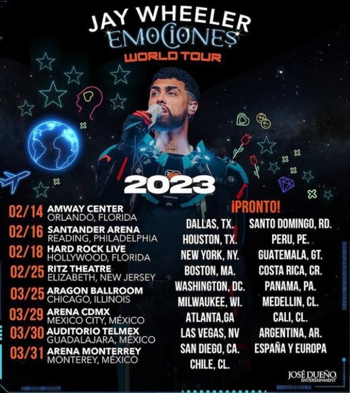 "Estoy súper entusiasmado y deseoso de que ya iniciemos la gira para reencontrarme con el público y cantarles toda mi música. Cada concierto será muy especial. Muchas gracias a los que disfrutan y apoyan mis canciones, también a todo el equipo de Emociones World Tour por el trabajo que han hecho para presentarle a los fanáticos una gran gira. ¡Qué febrero llegue ya!", comenta Jay Wheeler según indica PuntoTicket.