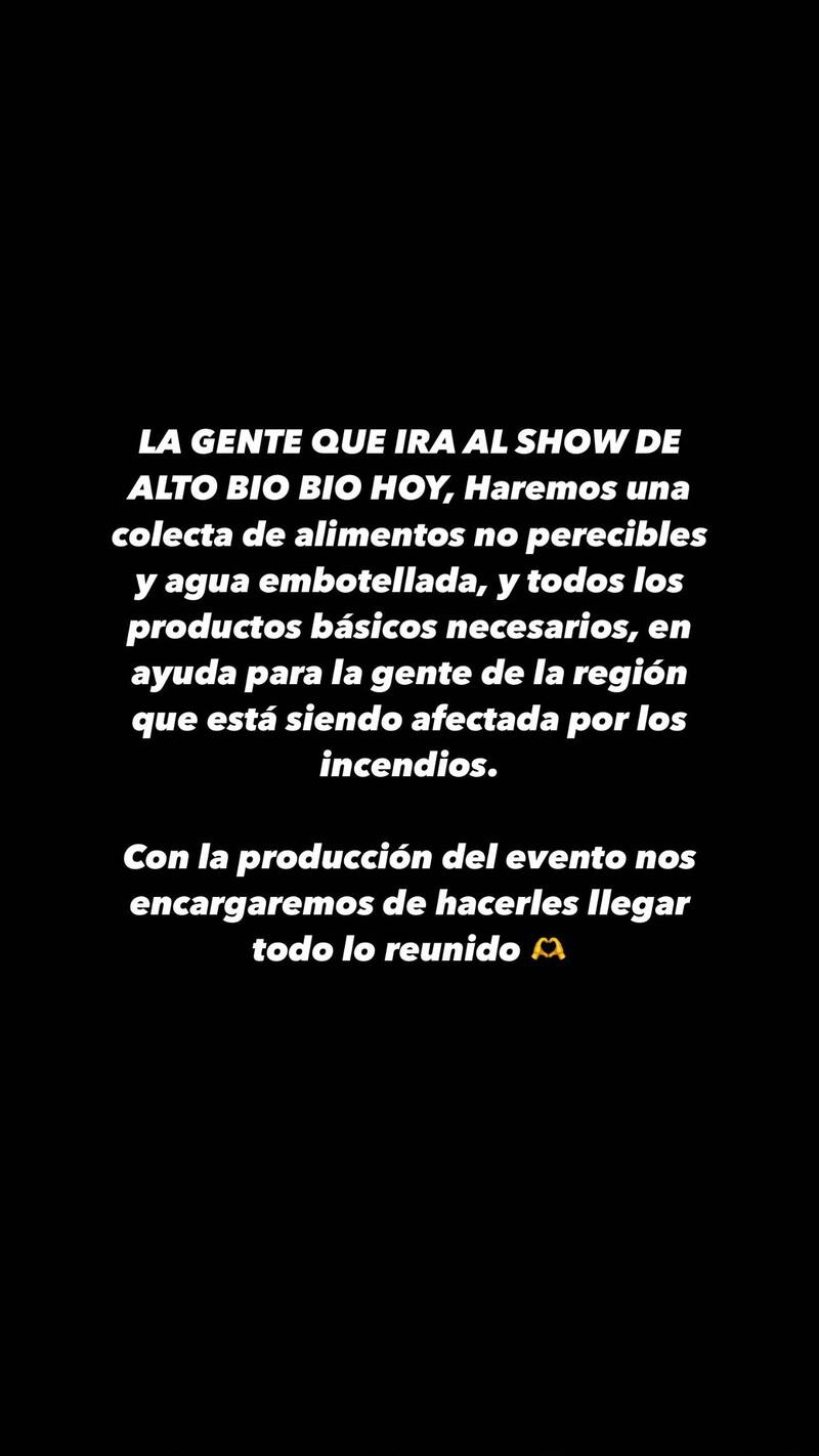 Sin embargo, Young Cister no se olvidó de la catástrofe que están provocando los grandes incendios en la zona sur del país, ya que realizó un llamado a sus fanáticos para que donaran diferentes cosas para los afectados: "La gente que ira al show de Alto Biobío hoy, haremos una colecta de alimentos no perecibles, agua embotellada, y todos los productos básicos necesarios, en ayuda para la gente de la región".