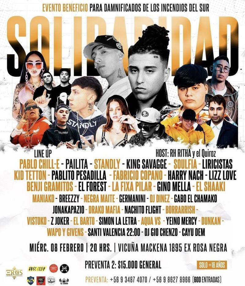 Entre los artistas que figuran en el show a beneficio para las víctimas de los incendios forestales son Pablo Chill-E, Pailita, Flor de Rap, Soulfia, Standly, Kid Tetton, Pablito Pesadilla, Benji Gramitos, Fabricio Copano, Harry Nach, entre otros.