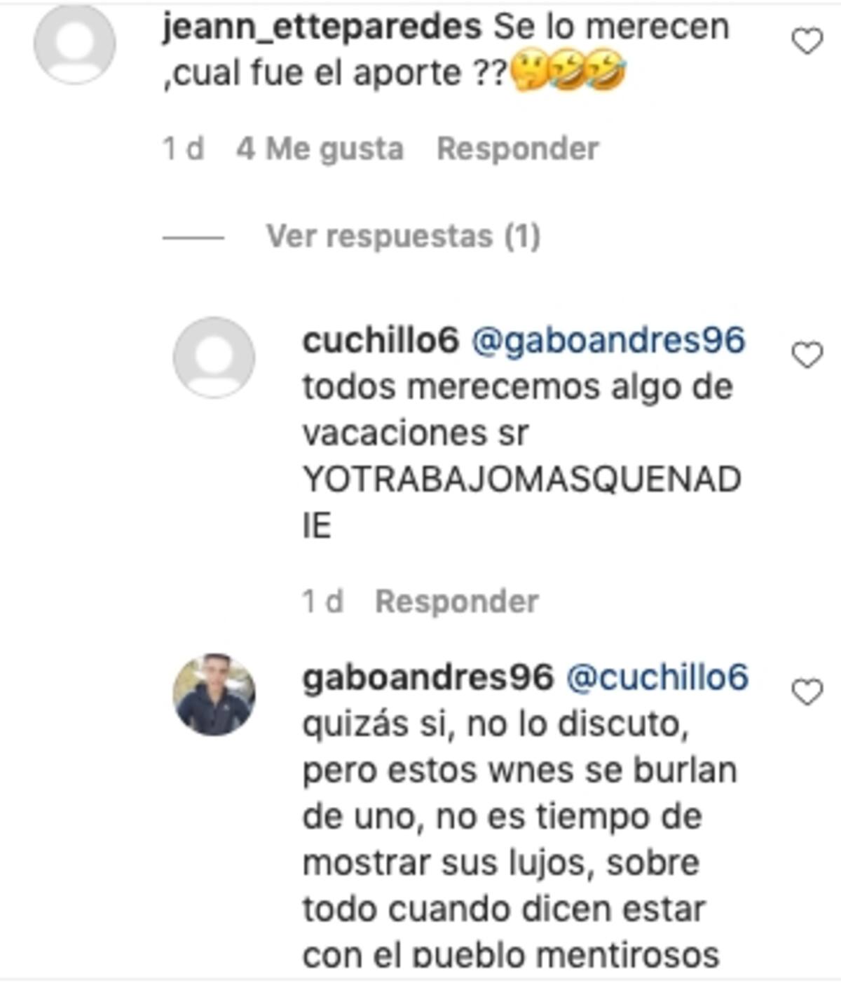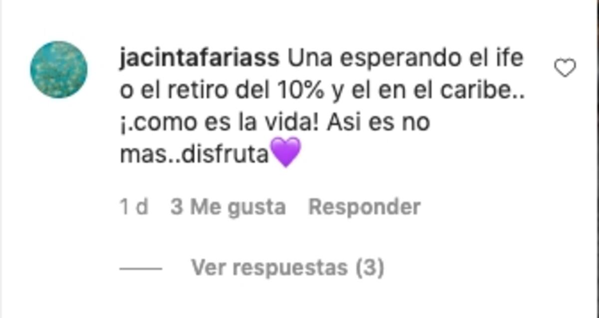Mientras que hubo muchos que lo criticaron por subir ese tipo de publicación: "Por favor!!! La situación del pais está critica, muchas personas pasando hambre", "¿Se lo merecen? ¿Cuál fue el aporte?, "Una esperando el retiro del 10% y él en el caribe", "Así cualquiera", "Qué injusta la vida", "Se burlan de uno, no es tiempo de mostrar sus lujos, sobre todo cuando dicen estar con el pueblo, mentirosos", entre otros.