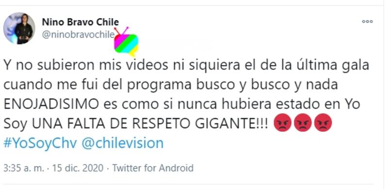 "Y no subieron mis videos, ni siquiera el de la última gala cuando me fui del programa. Busco y busco y nada", partió diciendo el eliminado de "Yo Soy" este domingo, aseverando que esto lo tiene "enojadísimo".