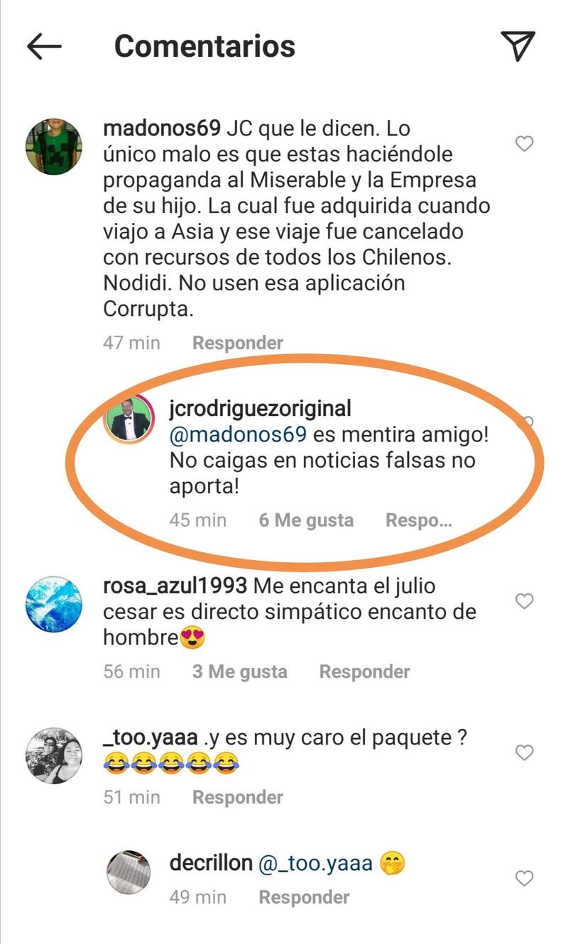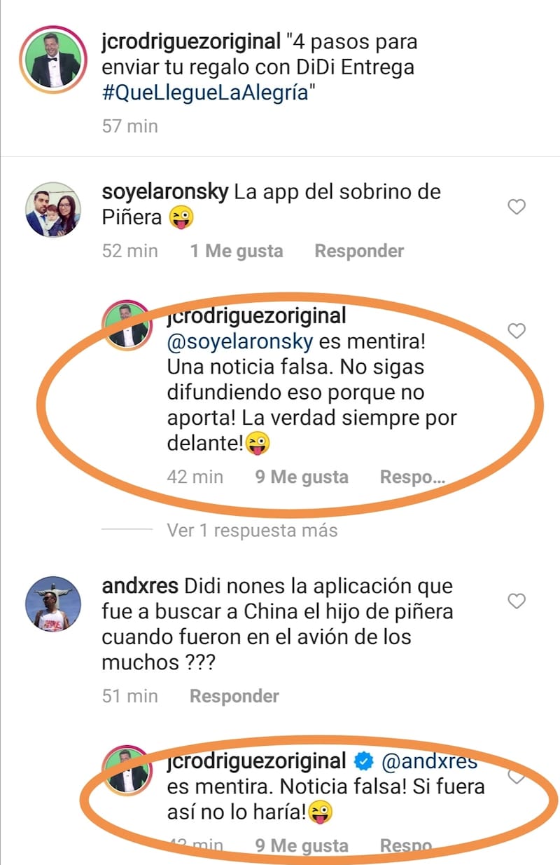 La crítica surgió cuando sus seguidores le empezaron a reprochar que la empresa, supuestamente, estaba ligada a la familia del Presidente Sebastián Piñera. Sin embrago, se trata de una noticia falsa que circuló sobre que Sebastián y Cristóbal, hijos del mandatario, podrían ser accionistas de la App.