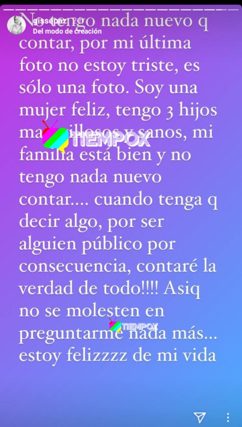 Gisella Gallardo mostró su molestia esta tarde en redes sociales ante el rumor de distanciamiento de su esposo, Mauricio Pinilla. La modelo y periodista publicó en sus historias de Instagram un mensaje que le envió Cecilia Gutiérrez, ex panelista de "me Late", donde le consultaba por este "chisme".