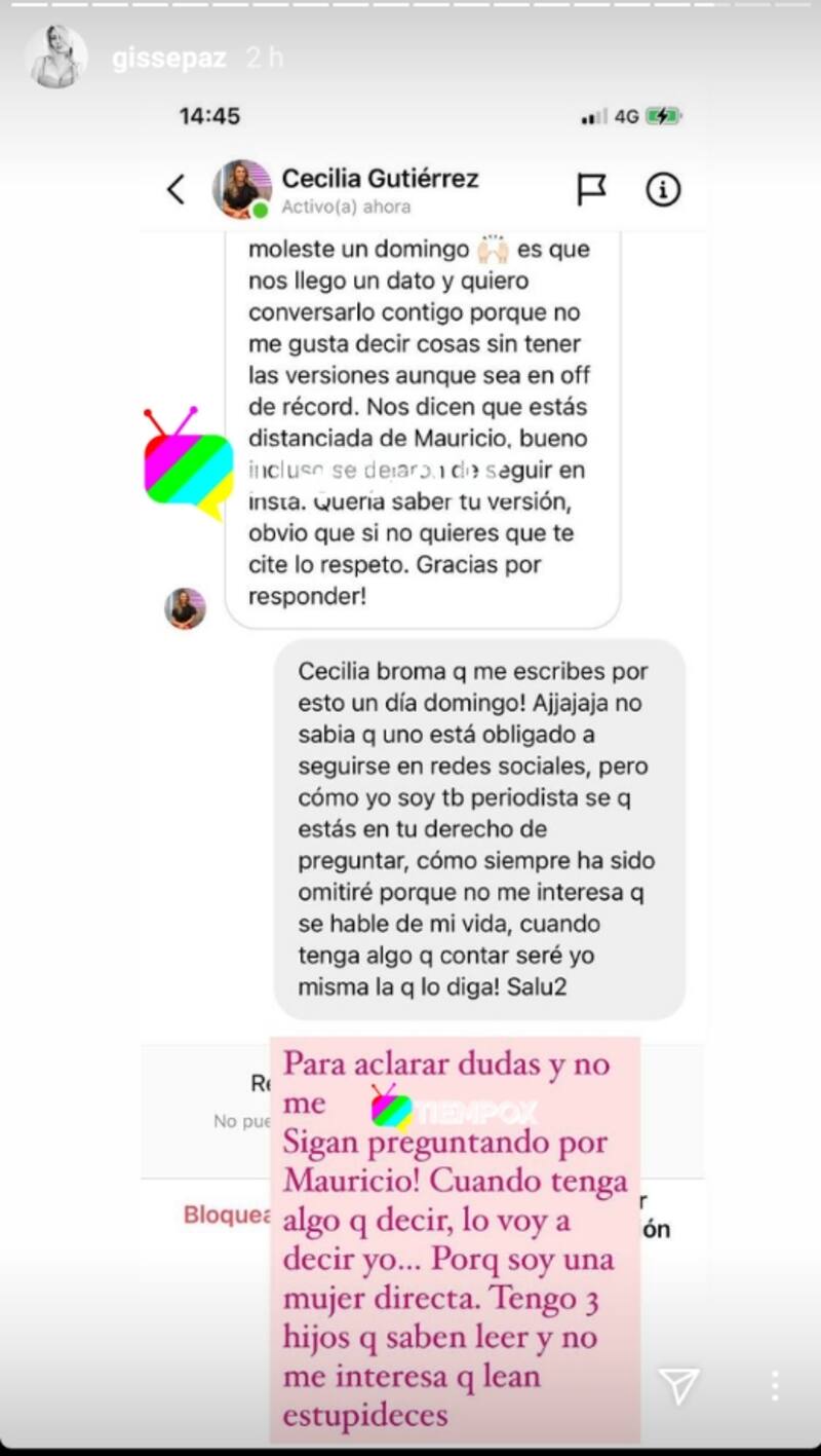"Nos dicen que estás distanciada de Mauricio, bueno, incluso se dejaron de seguir en Insta, quería saber tu versión. Obvio si no quieres que te cite, lo respeto, gracias por responder", le dijo la periodista.