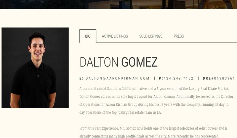 A pesar de su juventud Dalton Gomez tiene una importante carrera en el mundo de los bienes raíces en la lujosa corredora de propiedades Aaron Kirman Group. Tras cinco años en el rubro, el joven se ha convertido en un exitoso agente inmobiliario y maneja una exclusiva agenda de clientes.