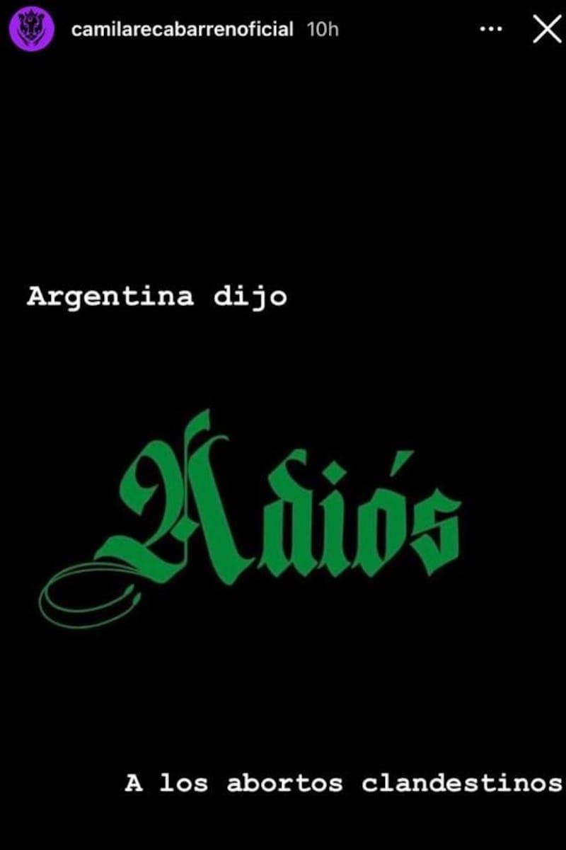 La modelo y actriz, Camila Recabarren, también se dio el espacio de aclamar este hito histórico del país vecino, tocando una de las problemáticas que se derivaban ante la ilegalidad del aborto. En sus historias de Instagram escribió: "Argentina dijo adiós a los abortos clandestinos".