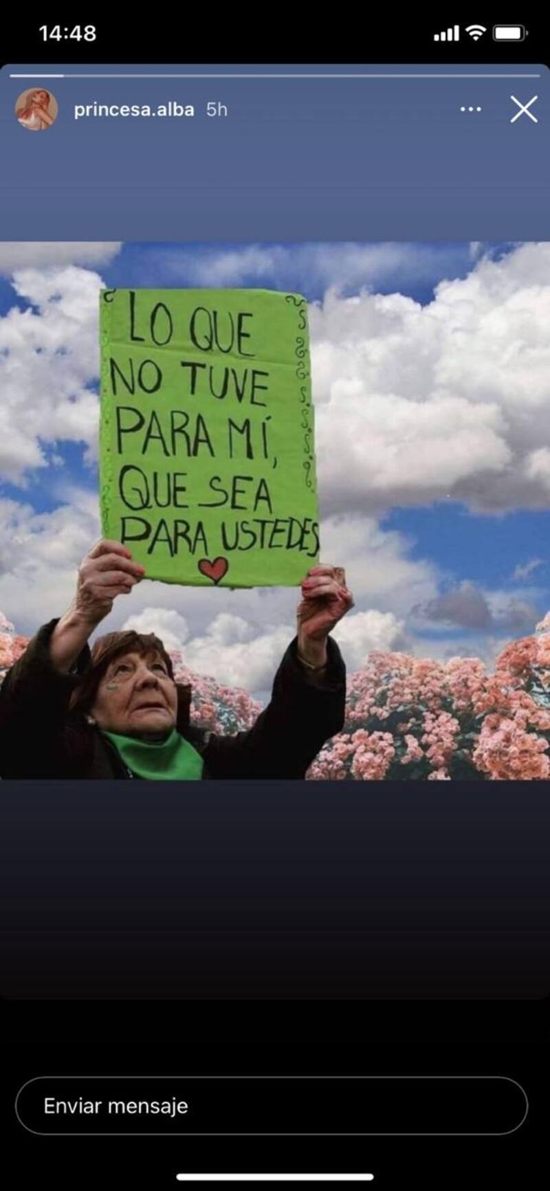 Trinidad Rivero, la cantante de trap chilena más conocida como "Princesa Alba", posteó en sus historias de Instagram una emotiva foto para celebrar la promulgación en Argentina. En ella se ve a una adulta mayor sosteniendo un cartel que dice: "Lo que no tuve para mí, que sea para ustedes".