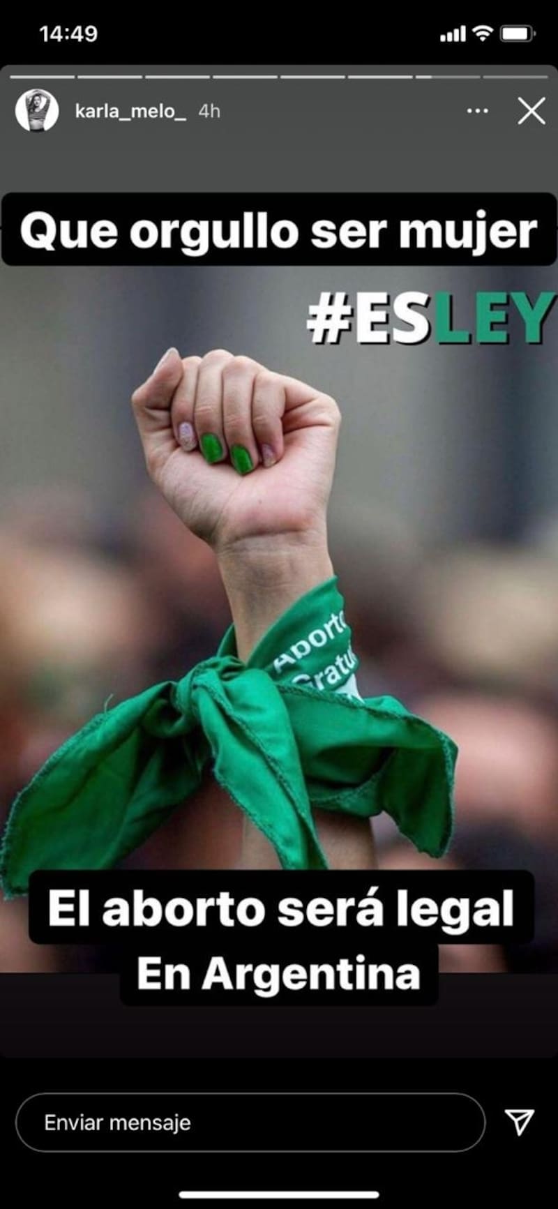 Karla Melo, la actriz chilena que siempre ha estado activa en cuanto a las demandas sociales y derechos de la mujer, también se pronunció. Subió a sus historias de Instagram una postal de un puño portando el pañuelo verde con la frase: "Qué orgullo ser mujer. El aborto será legal en Argentina".