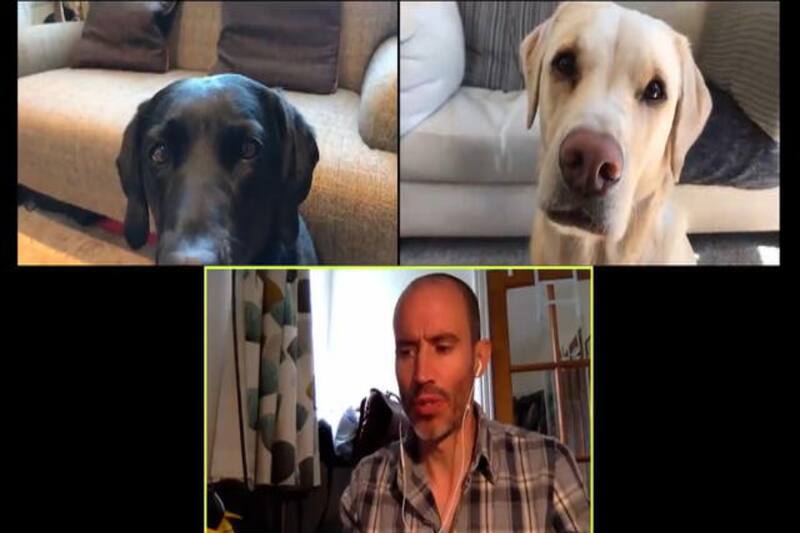 La hilarante conversación se dio a través de la conocida aplicación de llamada Zoom, donde Andrew Cotter, comentarista deportivo de la BBC mantuvo una conversación de “de negocios” con sus dos labradores llamados Olive y Mabel.
