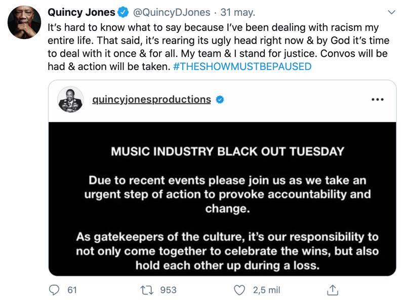 El compositor Quincy Jones fue otro de los artistas que se manifestó a través de redes sociales. En su cuenta personal de Twitter escribió: "Es difícil saber qué decir porque he estado lidiando con el racismo toda mi vida", "es hora de lidiar con eso de una vez por todas. Mi equipo y yo defendemos la justicia". El texto lo acompañó con una imagen de su productora adhiriéndose también a la causa.
