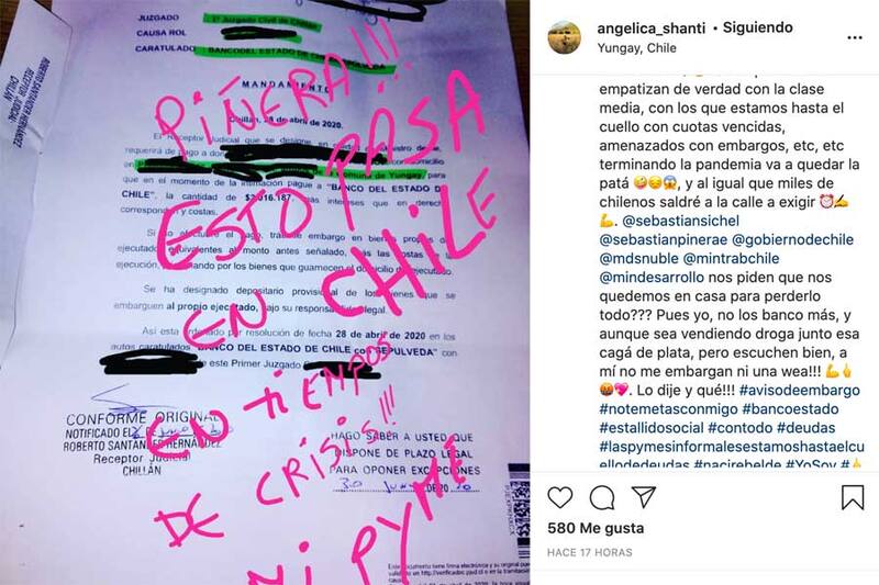 "Miren la tremenda sorpresita que tiró hoy a las 14:25 horas en el jardín de mi casa el simpático receptor Roberto Santander Hernández". Con ironía, Ángelica Sepúlveda contó en Instagram el complejo momento que está viviendo. BancoEstado emitió un mandato por una deuda de cerca de dos millones de pesos, que la tiene al borde del embargo.