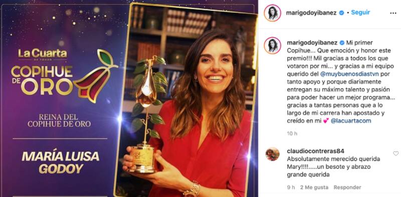 María Luisa Godoy, quien por primera vez ganó el premio, señaló en su cuenta de Instagram: "Mi primer Copihue. Que emoción y honor este premio. Mil gracias a todos los que votaron por mi".