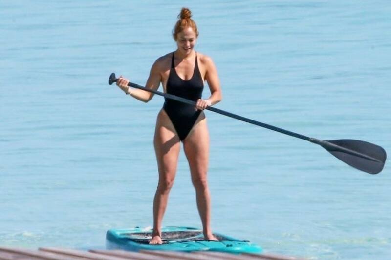 Una de las fotografías que se vieron de JLo, fue con un atrevido traje de baño negro de una pieza, mientras practicaba paddleboarding en el océano. Al salir del agua, se le vio con un vestido blanco que cubría su traje de baño mientras miraba el mar.
