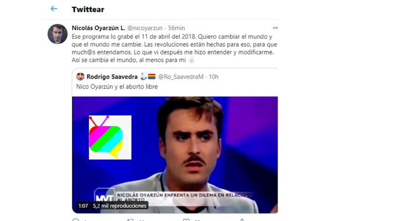 Luego de ser apuntado, Oyarzún alzó la voz a través de Twitter y explicó sus dichos asegurando que “ese programa lo grabé el 11 de abril del 2018. Quiero cambiar el mundo y que el mundo me cambie”.