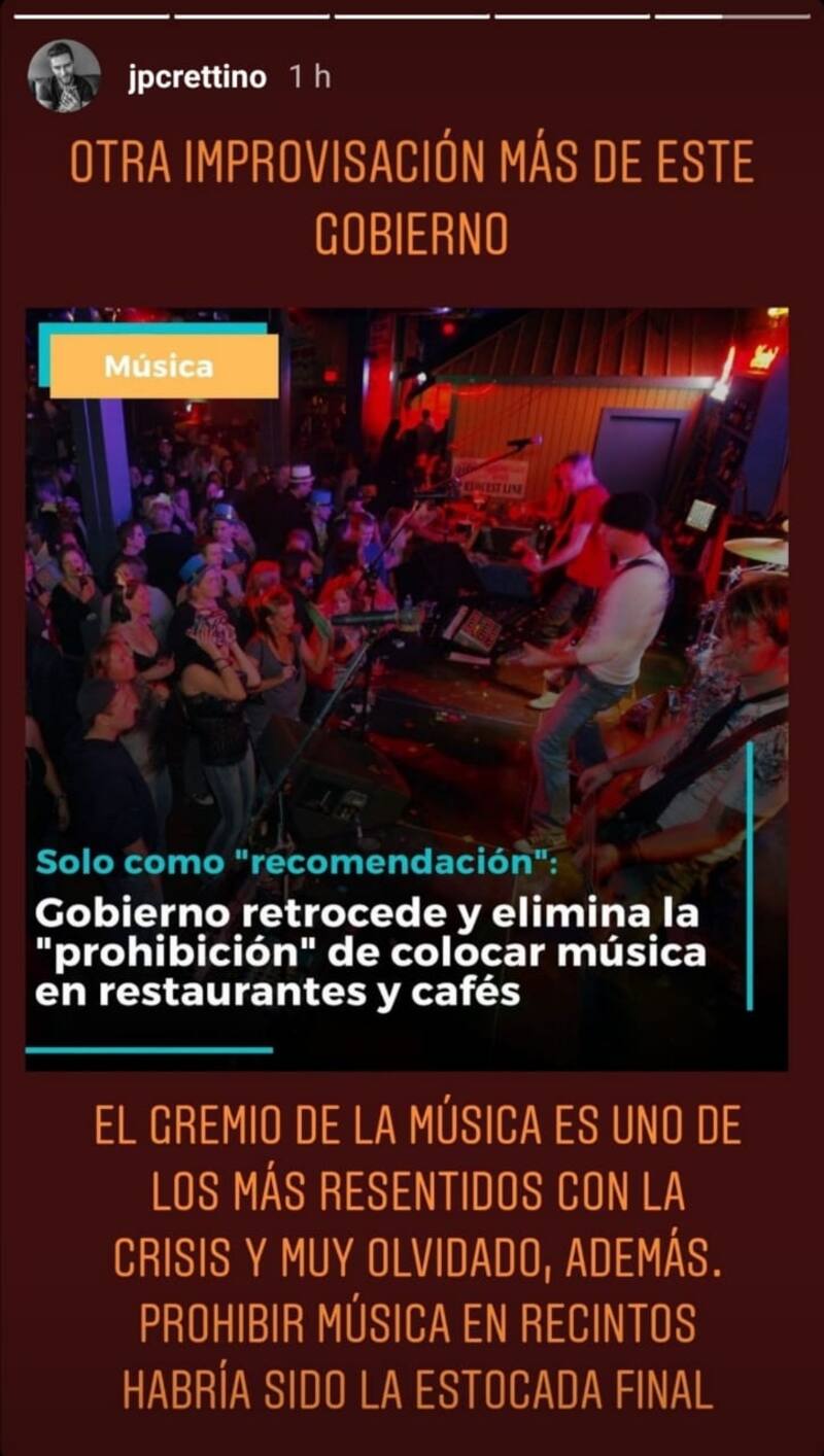 Menos de un día duró la medida del gobierno sobre la polémica prohibición de música en bares y restaurantes, algo que fue ampliamente criticado por músicos y artistas, entre ellos, Jean Philippe Cretton.
